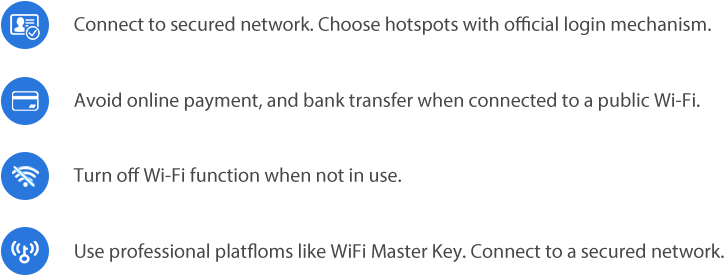 Please be careful when you are connecting to Wi-Fi hotspots in the public. According to the WiFi Master Security 2016 Report, risky Wi-Fi hotspots accounted for 1.52% of hotspots in China. 80% of this 1.52% risky hotspot are fake Wi-Fi hotspots. These fake Wi-Fi hotspots SSIDs often disguise as open network using names of well-known operators, merchants, and routers without login details. Please be careful when you are connecting to such hotspots.